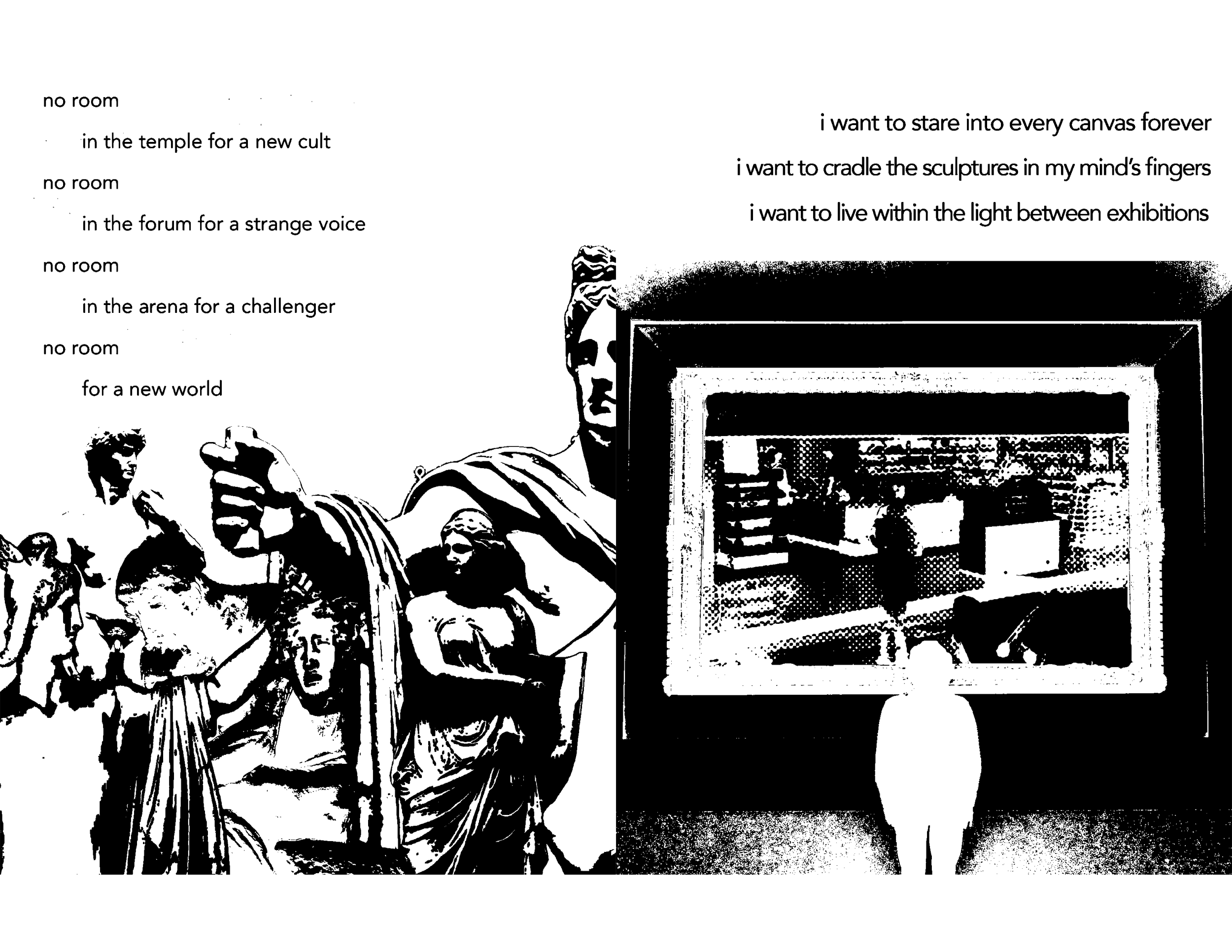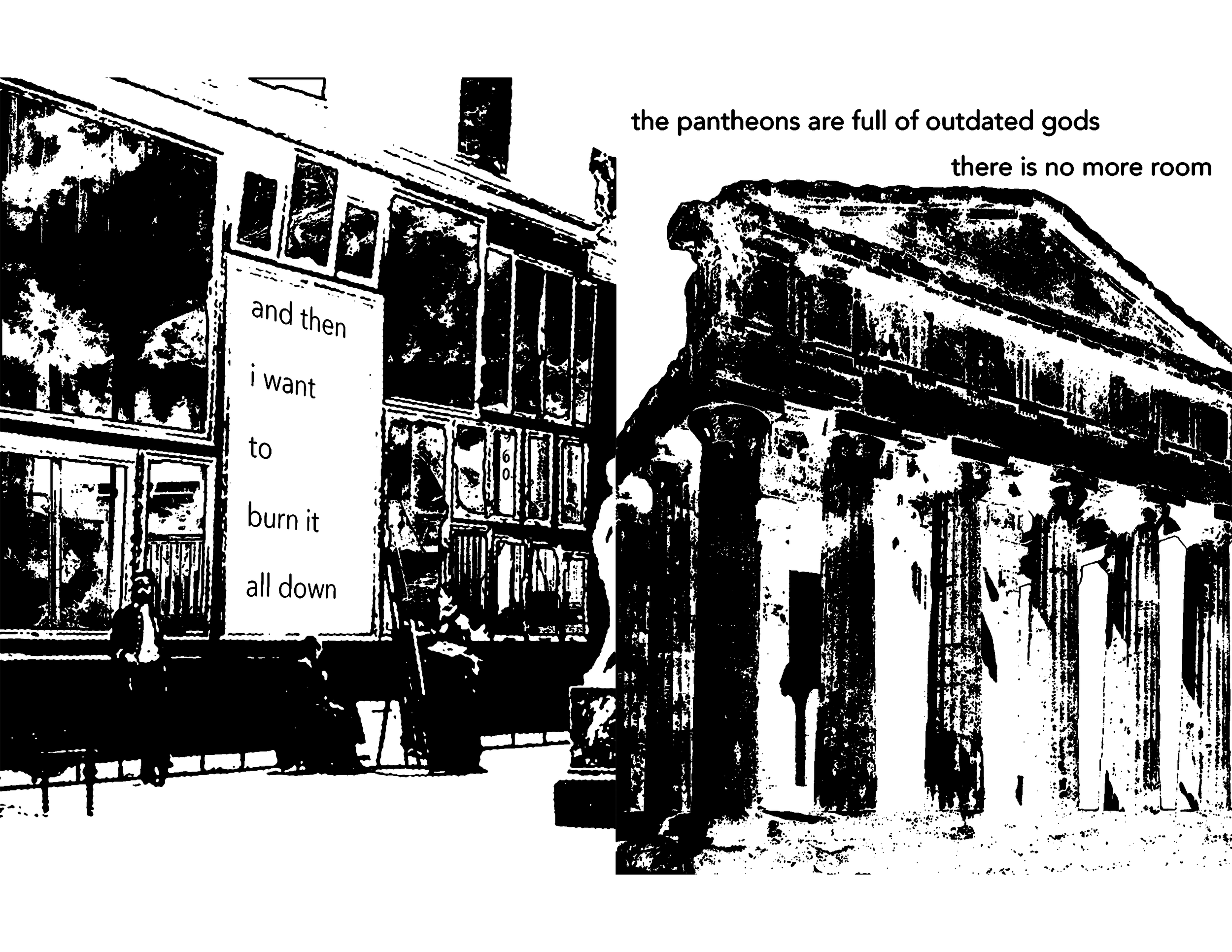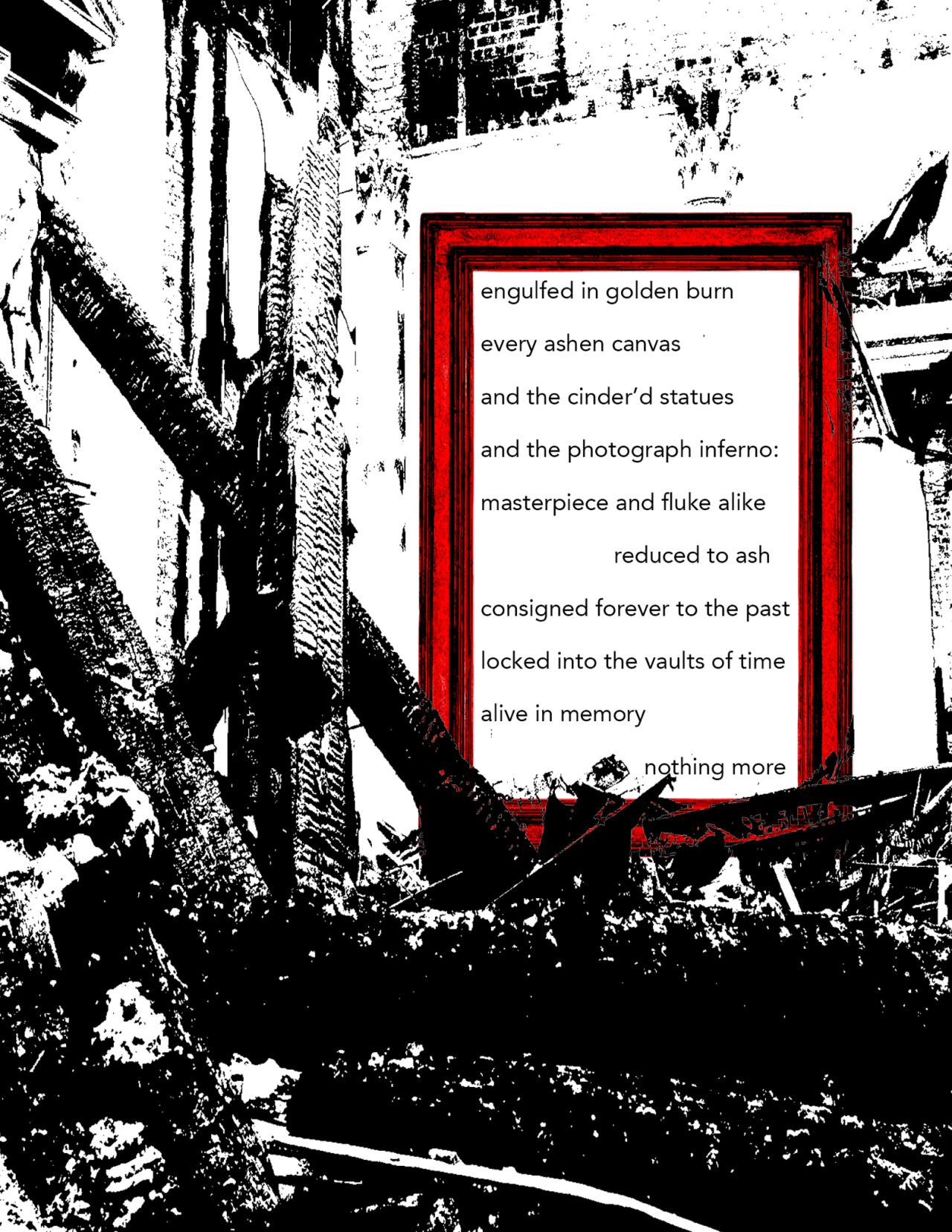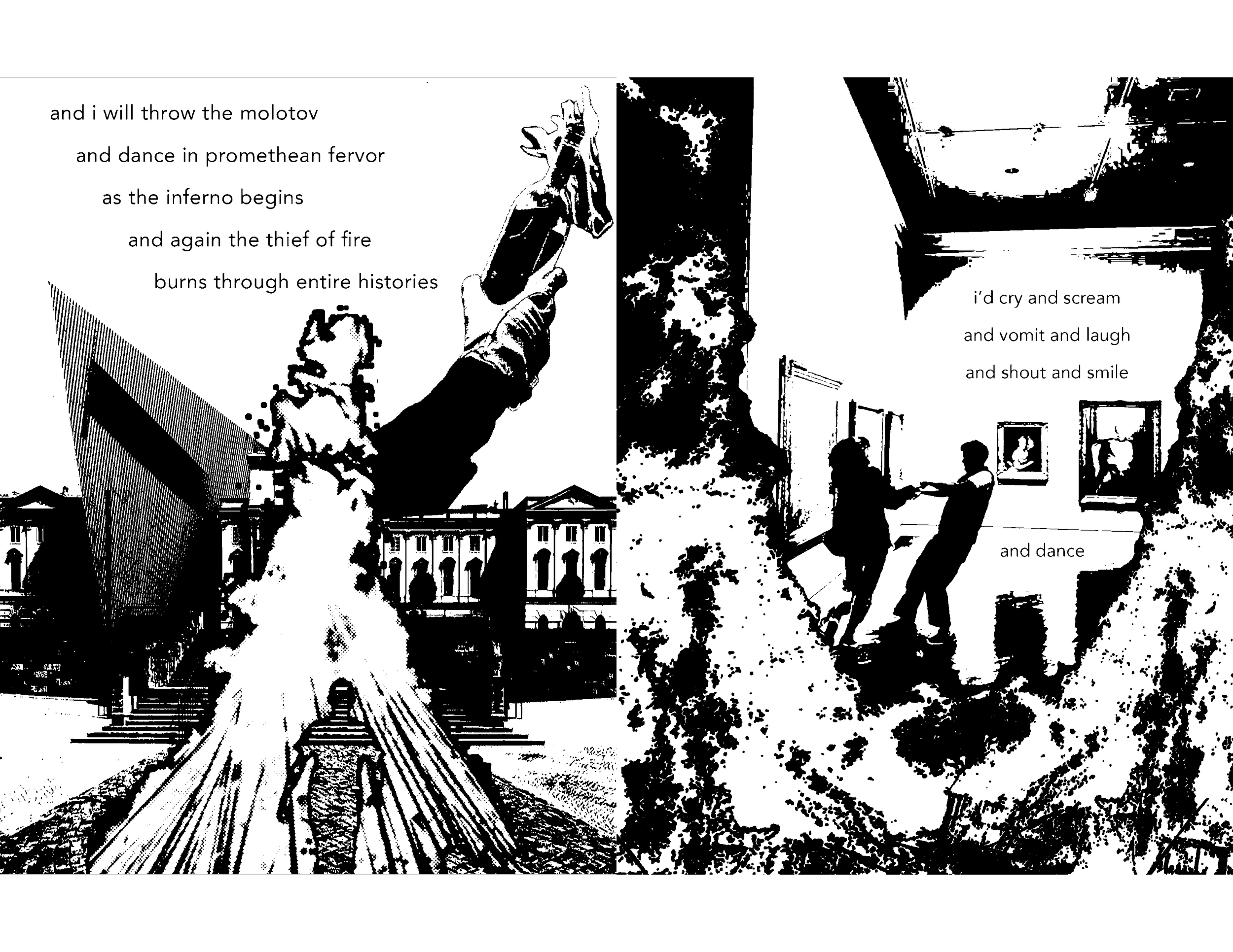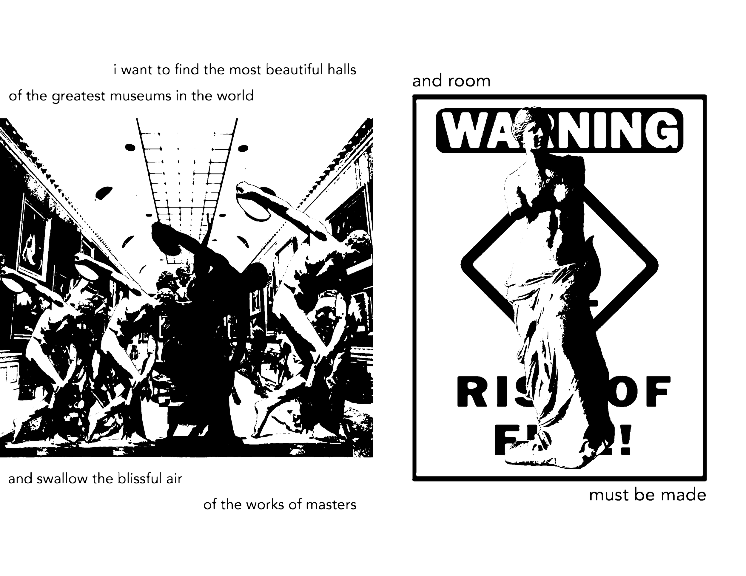 Born from my whining frustrations with legacy artists “taking up space” in the zeitgeist, leaving no space for new artists to thrive (thanks, Metallica), I began having vivid dreams of setting art galleries on fire and watching as they were rebuilt and filled with the works of new artists. Naturally, I had to expel this impulse, and arson seemed like an unproductive way to go. Instead, I made a zine / art book about it.